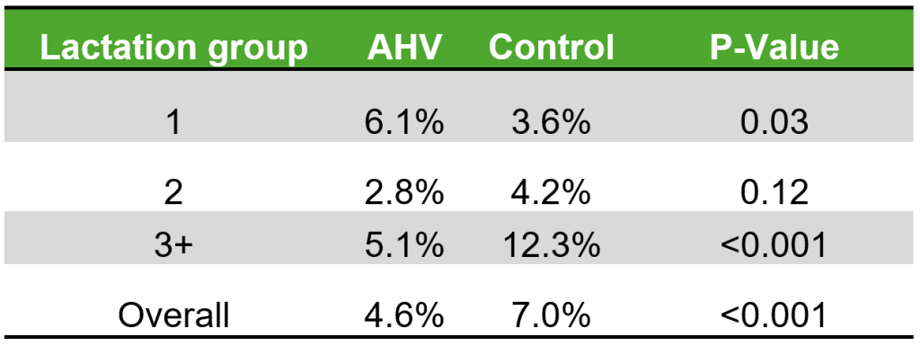 The protocol showed particularly strong results in cows with three or more lactations, where metritis incidence dropped from 12.3% in the control group to 5.1% in the AHV group. Similarly, retained placenta incidence in this group fell from 3.0% to 0.9%. These findings suggest that older cows may benefit most from proactive uterine health management.