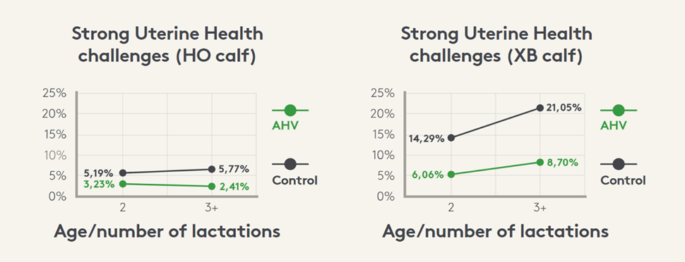 The main observations during this trial showed that for both the HO calves and the XB calves there was a reduction in the number of strong uterine issues in the AHV group. As you can see in figure 1. Of the control group, which was not given AHV products, 5.19% of dairy cows in the second lactation and 5.77% of cows in the third or higher lactation showed strong uterine health issues. On the other hand, of the cows that were given AHV’s products, only respectively 3,23% and 2,41% showed strong uterine health issues.