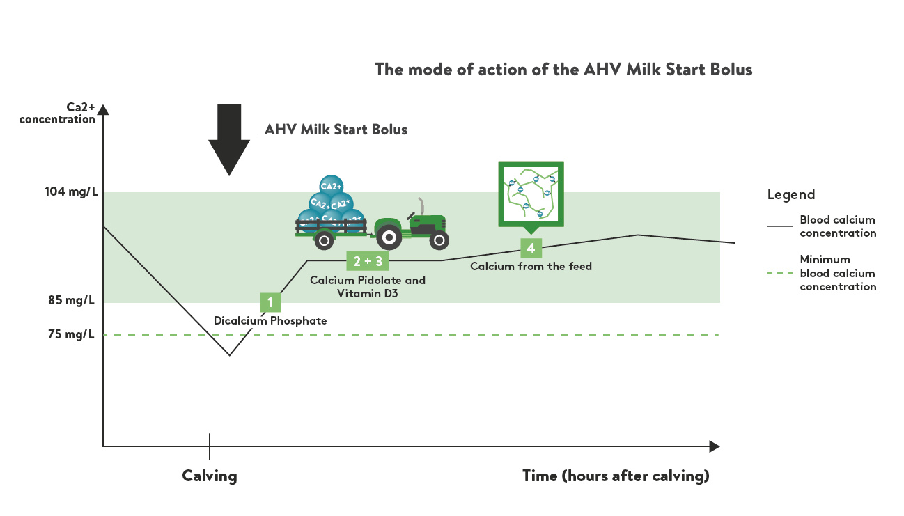 Research by the AHV Technical team confirms how important the right calcium source is. During the trial, blood samples from 31 cows were taken immediately after calving and the cows given one of three different calcium supplements. After four days, measurements revealed that while initial calcium levels were low, the AHV Milk Start Bolus group showed the greatest improvement, even though it contained less calcium compared to other supplements.